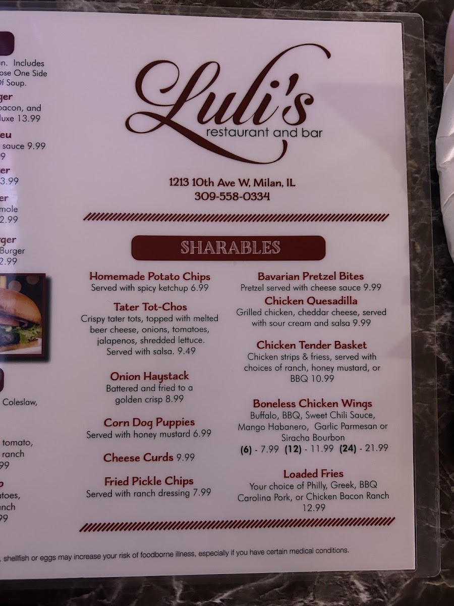Welcome to Luli's Restaurant and Bar, a hidden gem located in Milan, Illinois. This inviting establishment boasts a diverse menu that caters to a variety of tastes, ensuring that every visit is special. Begin your meal with their signature Mac and Cheese Nacho appetizer or dive straight into satisfying entrees like the Coconut Shrimp or Catfish Filets.